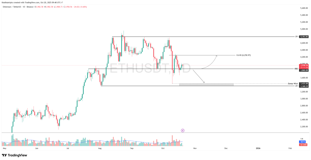 However, market participants need to be wary if the ETH price fails to hold and slips below the $3,860 level again. A downward break of this level would invalidate the RBS scenario and signal that buyers lack momentum, opening the door for a deeper correction. The next downside target is towards the next support zone between $3,368 – $3,435, which is the liquidity area from the previous sharp drop.
