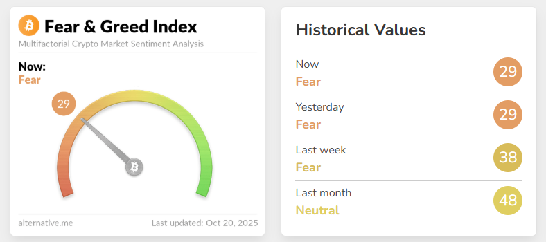 According to the latest Crypto Fear & Greed Index (October 20, 2025) data from alternative.me, the index value stands at 29 (Fear) – unchanged from the previous day, and down significantly from 38 last week and 48 a month ago.