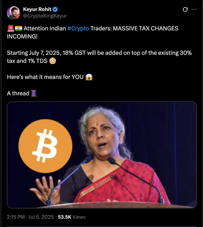 According to reports from Indian crypto traders on X, as of July 2025, global exchange Bybit began implementing an 18% Goods and Services Tax (GST) on all crypto-related services for Indian users.