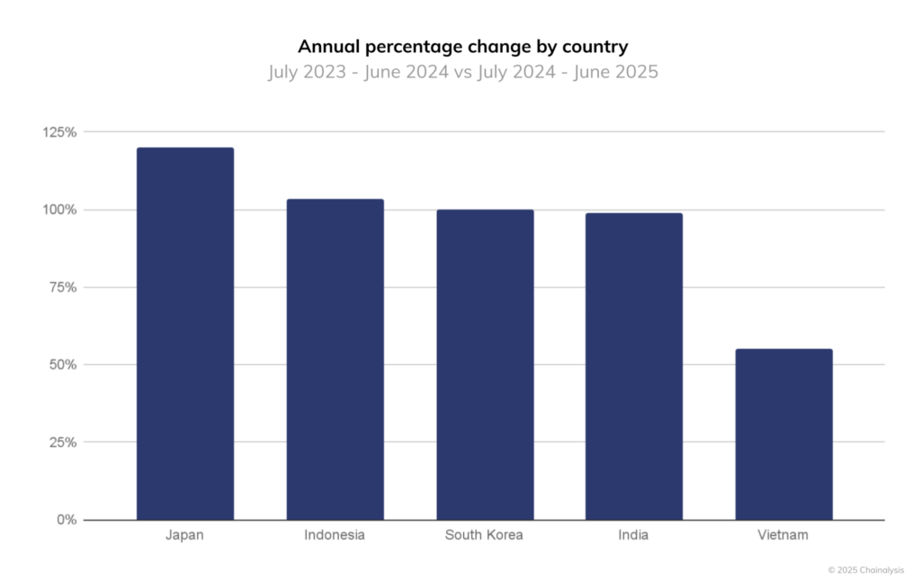 According to a recent Chainalysis report (September 24, 2025), Japan recorded the highest crypto growth rate among Asia-Pacific’s top five markets. On-chain crypto transaction volume in Japan grew 120% year-over-year by June 2025—outpacing Indonesia (103%), South Korea (100%), India (99%), and Vietnam (55%).