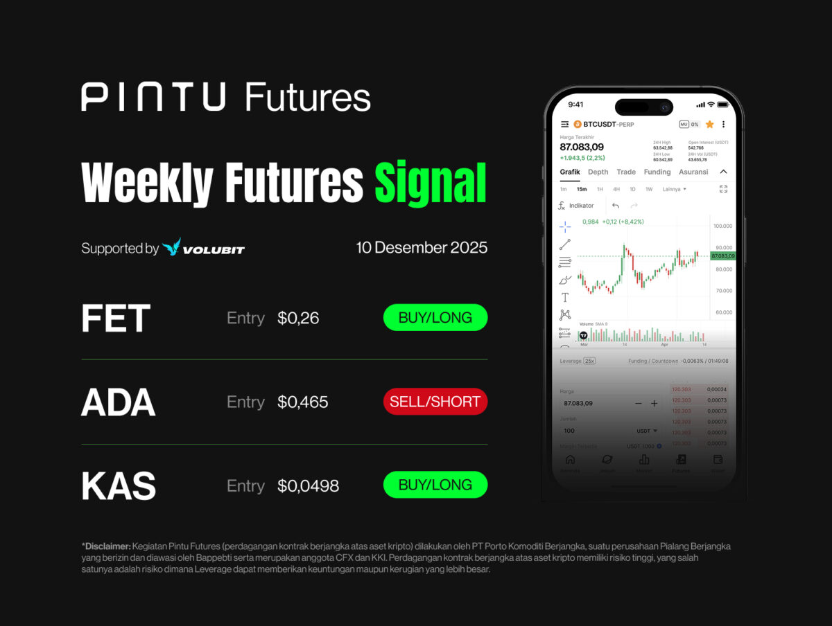 *Disclaimer: Pintu Futures activities (trading futures contracts on crypto assets) are carried out by PT Porto Komoditi Berjangka, a Futures Brokerage company licensed and supervised by Bappebti and is a member of CFX and KKI. Trading futures contracts on crypto assets has high risks, one of which is the risk that Leverage can provide greater profits or losses.