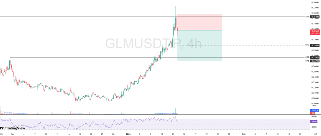 As long as the price of GLM still moves below the resistance area, the potential for continued correction remains open with a downward target towards the support area at $0.27678 as the main target.