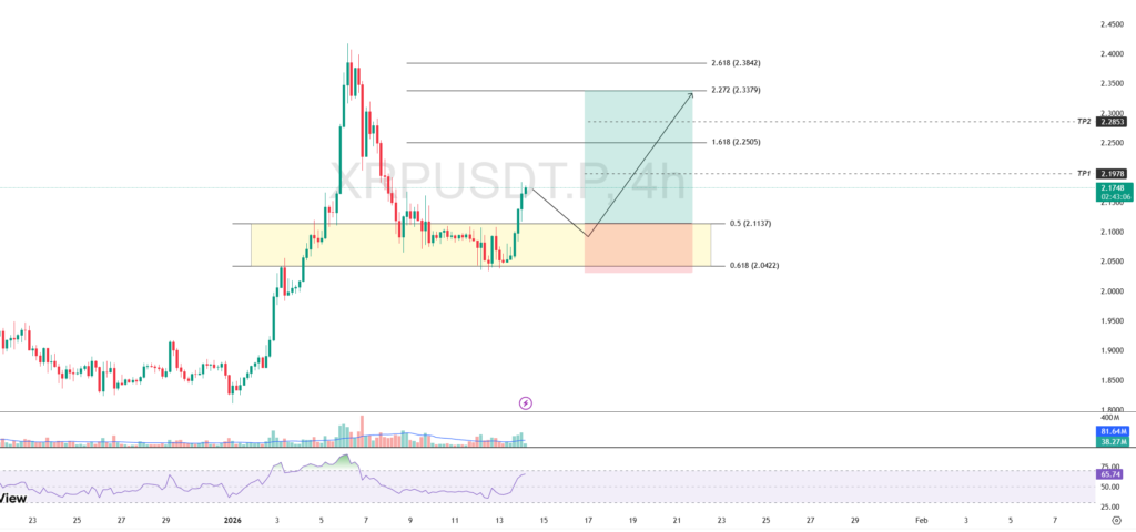 The selling pressure on XRP successfully subsided after the price touched the harmonic support that coincides with the full Fibonacci retracement area in the range of $2.0422 – $2.1137. This area triggered significant buying, prompting a reversal from a downtrend to an uptrend in the short term.