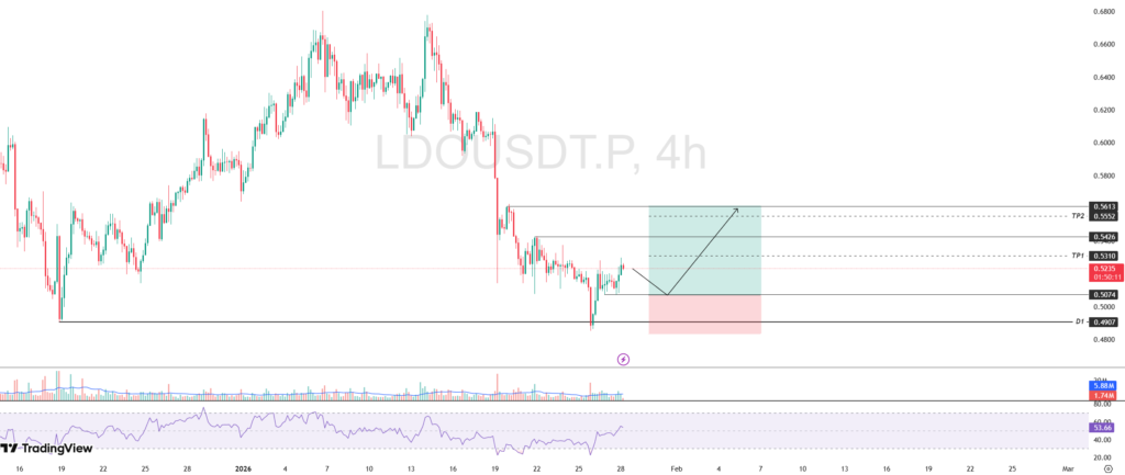 The selling pressure on LDO was relieved after the price touched a strong support area, which was the lowest price on December 18, 2025 at $0.4907. In this zone, a significant increase in buying pressure led to a reversal from a downward phase to an upward phase in the short term.