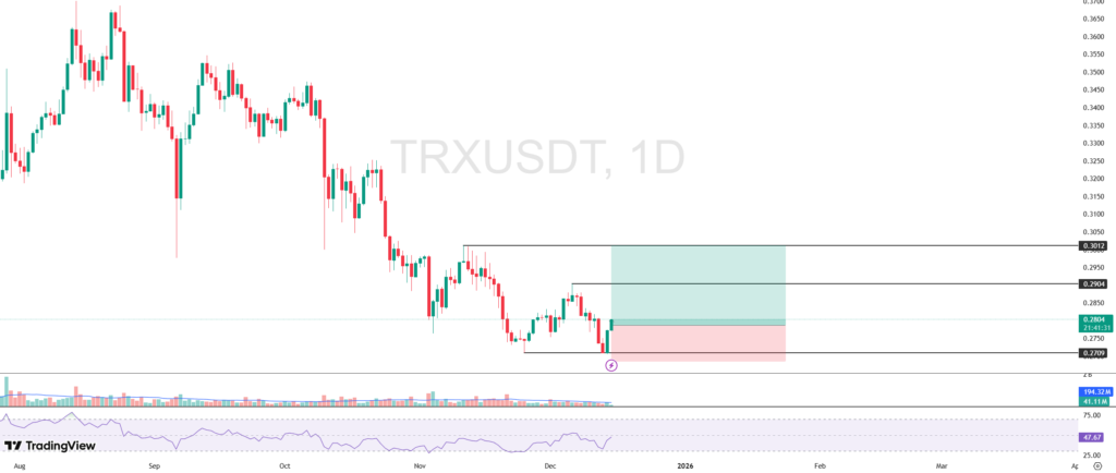 TRX’s price movement showed signs of recovery after selling pressure was successfully contained in a crucial support area that coincided with the lowest closing level on November 25, at IDR 4,512 ($0.2709). This zone proved to be a strong accumulation area, characterized by increased buying pressure that was able to reverse the price direction from the correction phase to rebound.