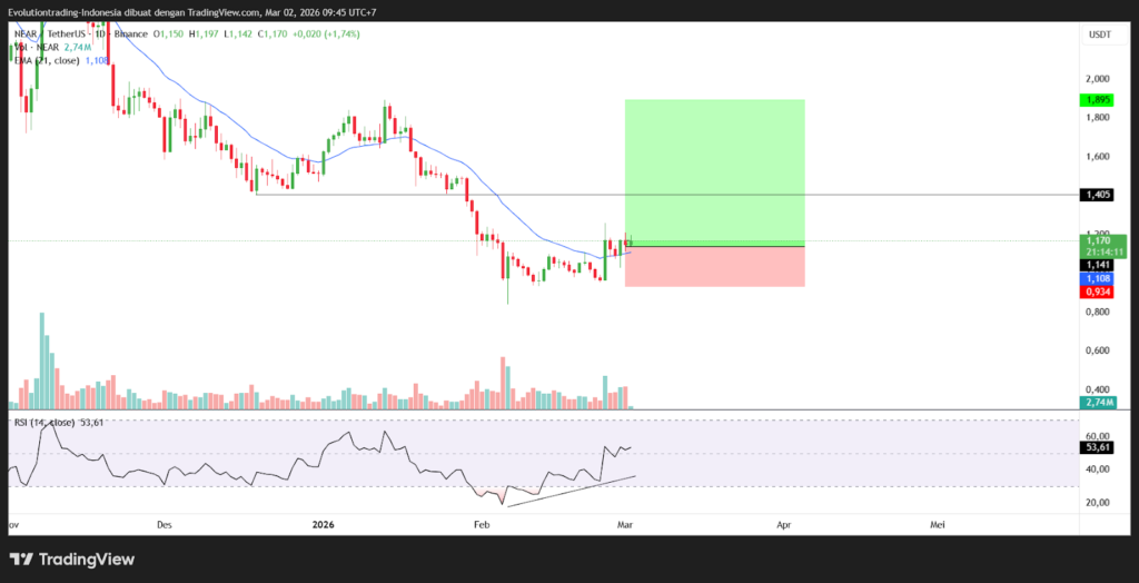NEAR’s upside target is its support become resistance at $1,405 and if NEAR can break the level, the next potential upside target is at $1,895.