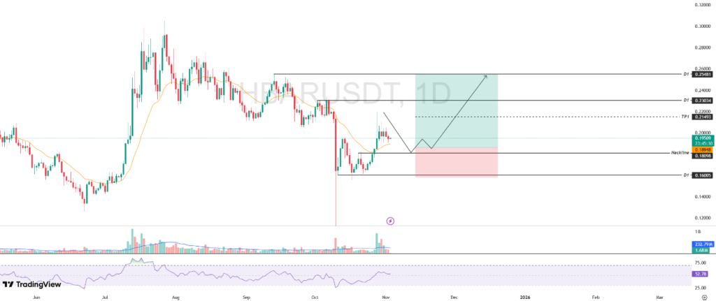 The price movement of HBAR shows signs of strengthening after successfully breaking the neckline of the double bottom pattern at the level of Rp3.011 ($0.18098). This level has now turned into RBS (Resistance Become Support), signaling a potential trend change from bearish to bullish.