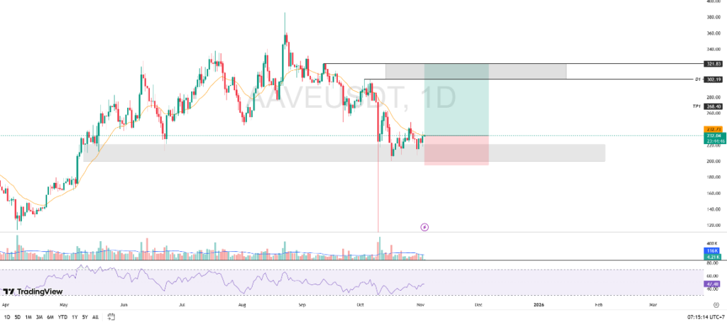 AAVE prices are showing signs of strengthening after successfully rebounding from the strong support area in the range of IDR3,330,428-Rp3,672,339 ($200.17-$220.72). This zone still acts as a major stronghold that has resisted selling pressure in recent days.