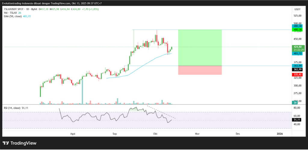 However, caution is needed in analysis and entry, due to the presence of bearish signals or potential short-term correction, namely the formation of a bearish divergence from the RSI. Another consideration is that, referring to TSLA stock, it is facing rejection from a key resistance area on the 1-day timeframe. Thus, there is a potential that TSLAX, along with TSLA stock, may correct first before continuing its rise.