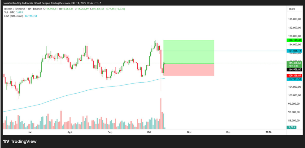 • Take Profit [TP]: TP1: $121,000 – $126,000 (Rp 2,005,575,000 – Rp 2,088,450,000)