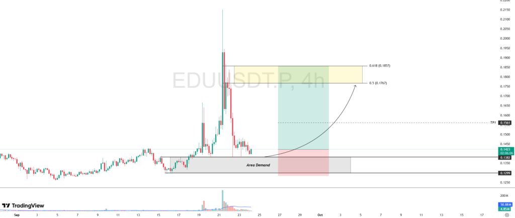 The bullish movement of EDU on September 20–21 halted at the peak level of $0.2150 before undergoing a correction. The price then found strong support within the demand zone of $0.1299–$0.1382.