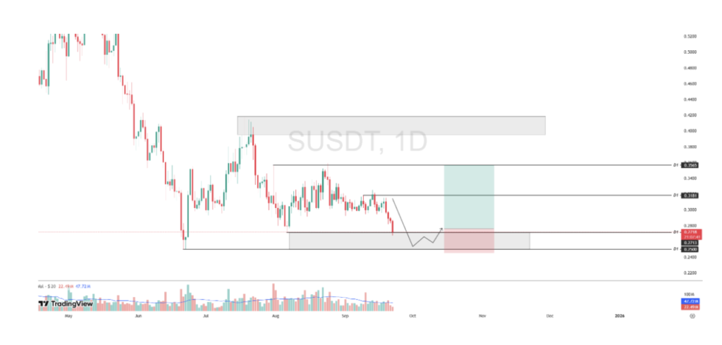 After facing rejection on August 24, Sonic’s price continued to decline, reaching the support cluster at Rp4.153 – Rp4.507 ($0.2500 – $0.2713). This zone presents a potential buying opportunity, provided that the price shows a valid rebound signal from the support area.