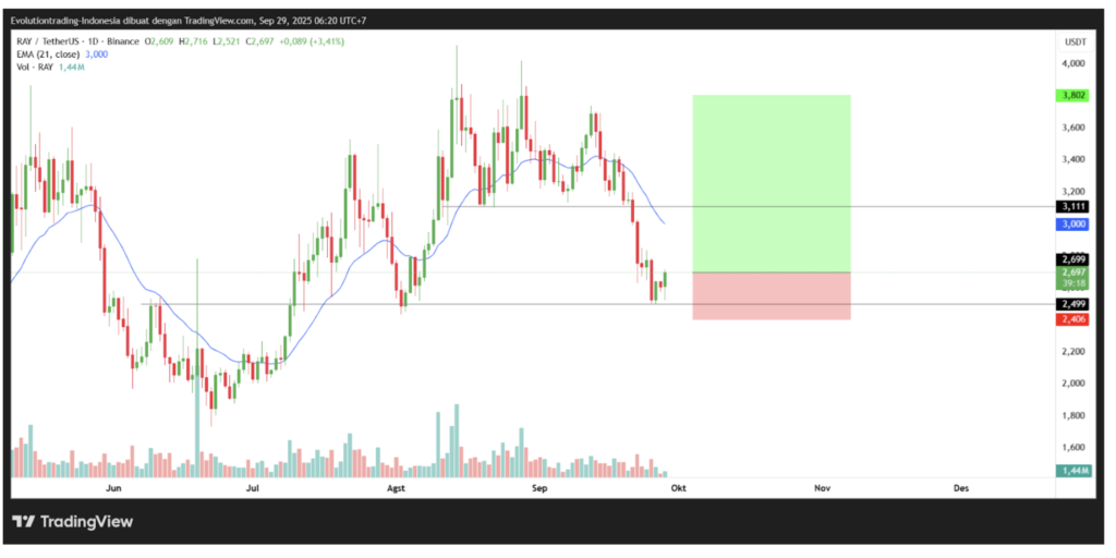 Raydium appears to be showing signs of a potential bullish reversal, as indicated by the formation of a harami candlestick on the 1-day timeframe when the price tested its support at $2.5 (Rp41.812).