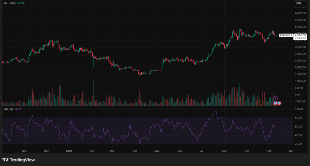 The Money Flow Index (MFI) displays a value ranging from 0 to 100. A reading above 80 is typically seen as a sign of an overbought condition, suggesting that the price may be too high and could face a correction. Conversely, a reading below 20 indicates an oversold condition, meaning the price may be undervalued and could experience an upward move. According to CoinMarketCap and Investopedia, a price increase accompanied by high trading volume reflects strong capital inflows, while a price decline with high volume signals significant selling pressure.