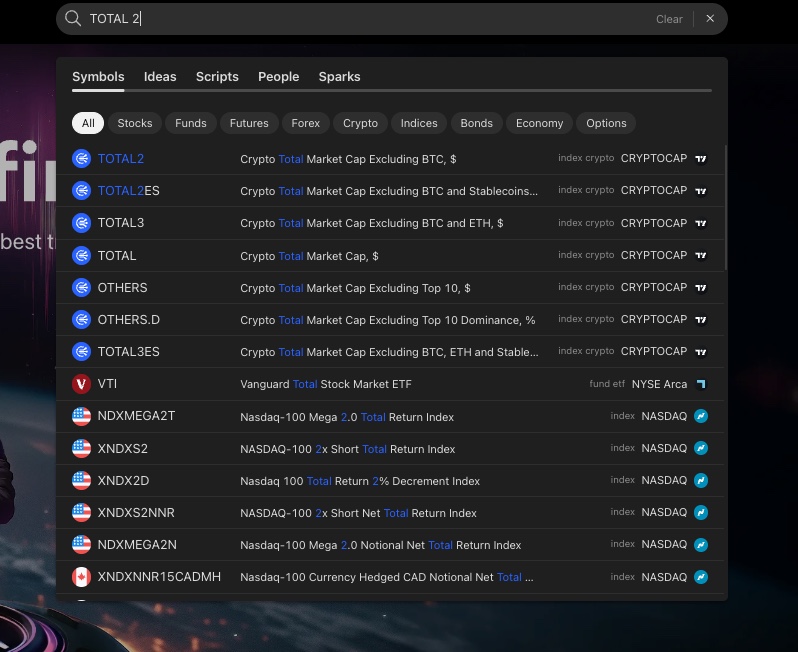 In the search bar, type “TOTAL2” and select “TOTAL2 Crypto Total Market Cap Excluding BTC, $” to display the total market capitalization of altcoins excluding Bitcoin.