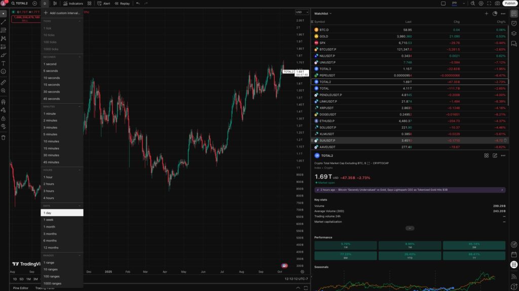 Interestingly, in the crypto market, you can view market capitalization either for the entire market or for specific groups of assets, such as altcoins alone. The indicator that shows the total market value of all altcoins excluding Bitcoin is known as TOTAL2. This data is available in chart form, accessible and analyzable for free, making it highly useful for traders to understand the structure of the altcoin market.