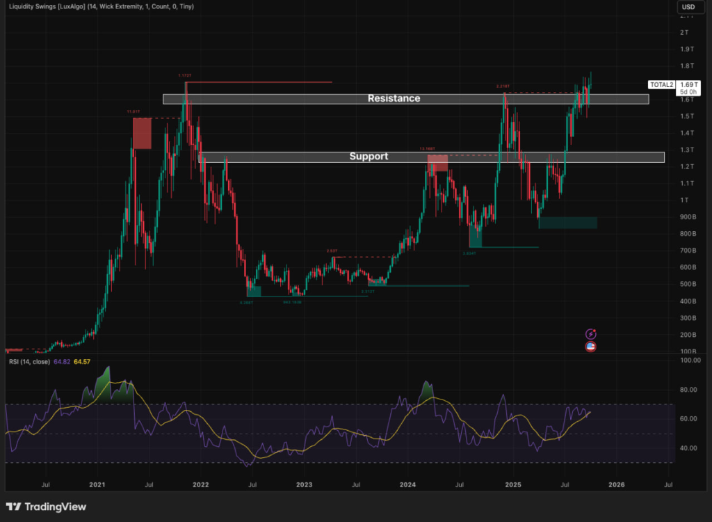 TOTAL2 is a composite index that represents the total market capitalization of all altcoins, excluding Bitcoin. This index is available on charting platforms such as TradingView and is commonly used to analyze market cycles as well as perform technical analysis on altcoin movements in the market.