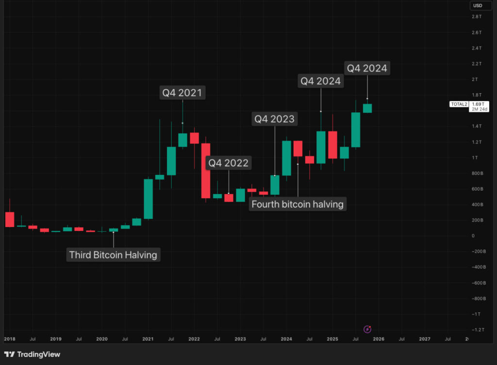 For example, in Q4 2023, the rally during that period occurred before the Bitcoin halving, and this movement was reflected in a spike in altcoin market capitalization visible on the TOTAL2 chart.