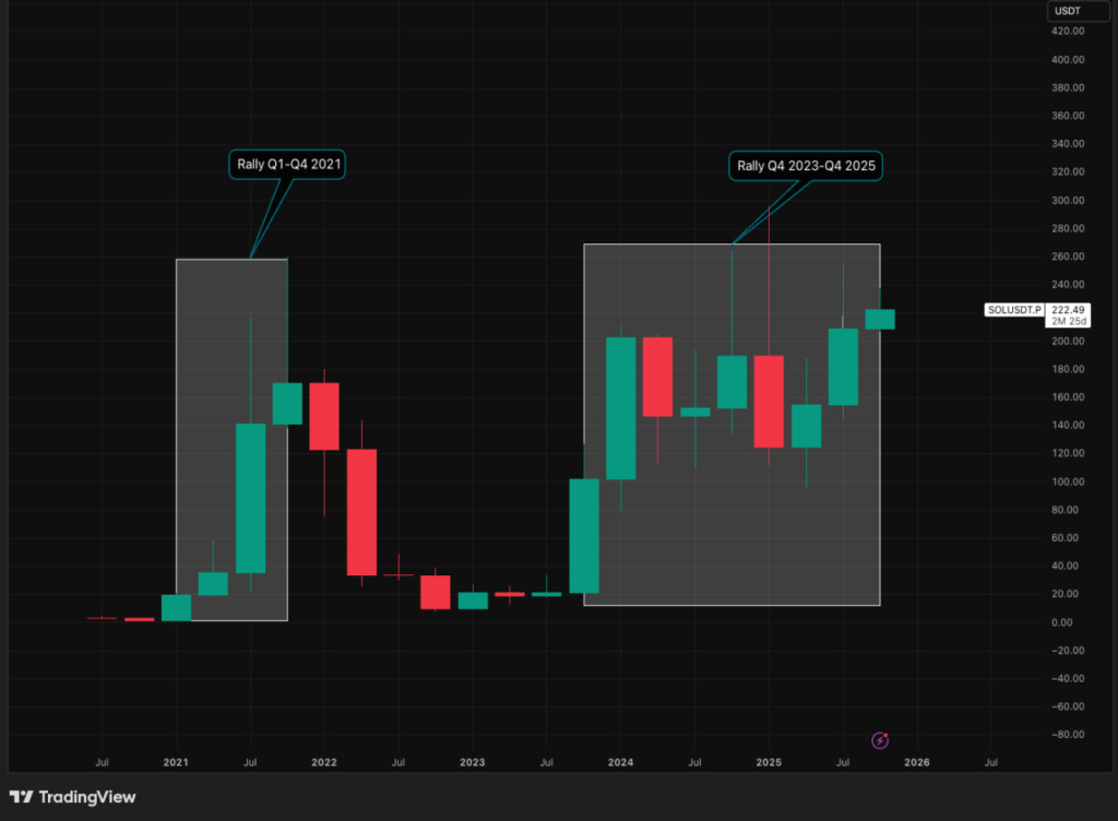 After the third Bitcoin halving, $SOL experienced a strong rally throughout Q1 to Q4 2021. This movement was also reflected in the TOTAL2 chart, which showed a significant surge in overall altcoin market capitalization, including $SOL.
