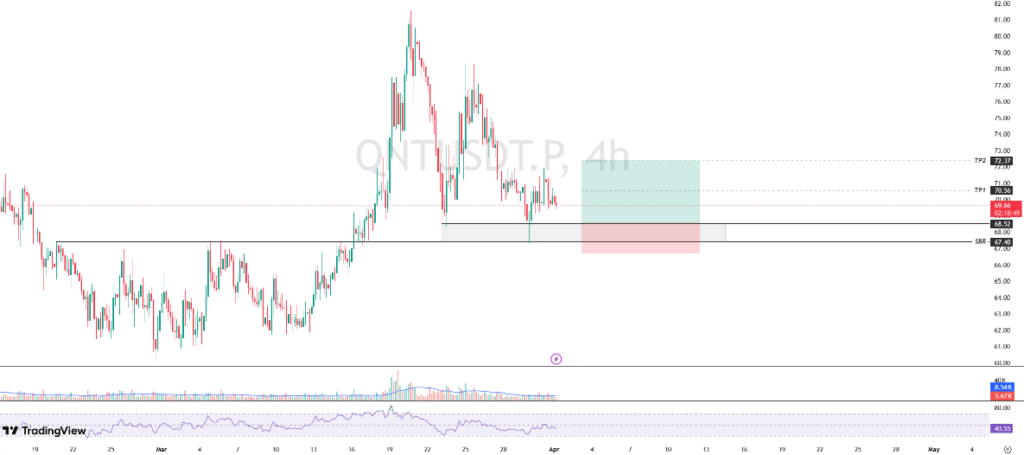 Reaksi harga setelah menyentuh area tersebut akan menjadi kunci. Jika terjadi rebound yang valid, maka QNT berpotensi melanjutkan kenaikan dengan target menuju $72.37.
