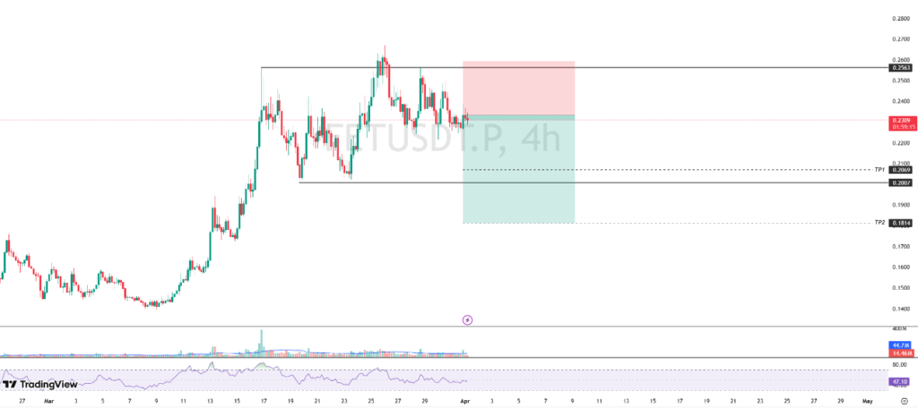 Pergerakan harga FET menunjukkan tekanan jual yang cukup kuat setelah gagal menembus resistance di level $0.2563, yang memicu pembalikan arah dari naik menjadi turun.