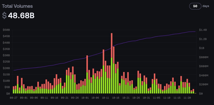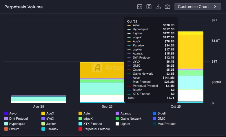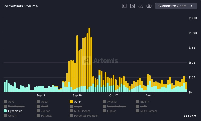 Sejak 24 September hingga 6 Oktober 2025, volume trading Aster melonjak sangat drastis hingga menembus angka $100 miliar. Namun, hingga artikel ini dibuat, belum ada penjelasan resmi mengenai faktor utama di balik lonjakan tersebut. Setelah periode itu berakhir, volume trading kembali mengalami penurunan signifikan dan kini terus bersaing ketat dengan Hyperliquid.