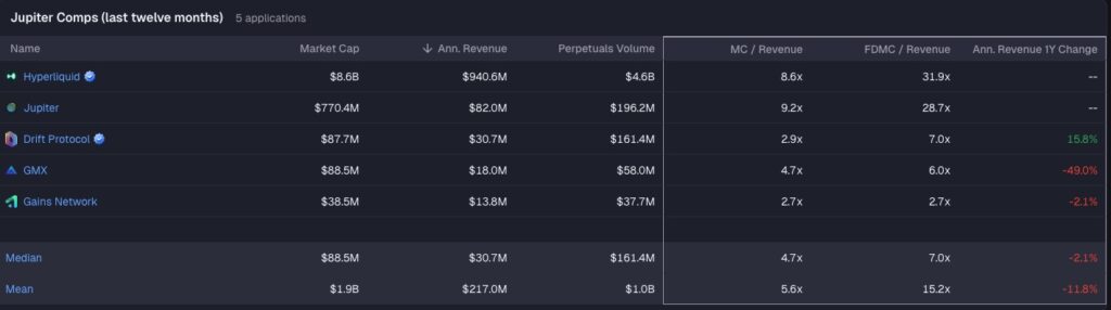 Dari sisi pendapatan selama 1 tahun terakhir, Jupiter berhasil mencatatkan pendapatan sekitar $82 juta. Jumlah tersebut sebenarnya tergolong tinggi, namun masih jauh di bawah pendapatan yang diraih oleh Hyperliquid, meskipun Jupiter memiliki produk dan fitur yang lebih banyak. Hal ini cukup wajar, karena sejak awal Jupiter dibangun, mereka memiliki fokus utama menjadi agregator pertukaran aset dengan harga terbaik untuk pengguna, sebelum berkembang ke produk lainnya.