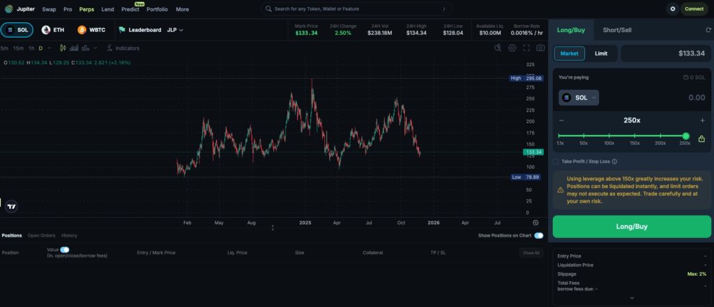 - Jupiter Perps: Layanan yang menawarkan perdagangan perpetual futures dengan leverage hingga 250x untuk tiga aset utama: SOL, BTC, dan ETH. Berbeda dengan platform lain yang menyediakan banyak kontrak, Jupiter justru memilih pendekatan yang fokus dengan hanya menyediakan tiga jenis kontrak tersebut.