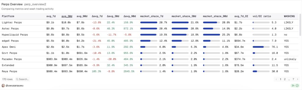 Selain menunjukkan skala volume, data ini juga memberikan sinyal mengenai kualitasnya. Lighter dan Aster tercatat memiliki status “LIKELY”, yang berarti volume mereka berpotensi dipengaruhi aktivitas non-organik. Berbeda dengan Hyperliquid, yang memperoleh status “no”, menunjukkan bahwa pertumbuhan volumenya lebih alami dan berasal dari aktivitas trading yang organik.