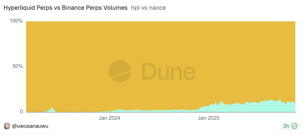 Jika dibandingkan dengan volume trading perpetual Binance, terlihat bahwa posisi Hyperliquid masih jauh lebih kecil. Grafik tersebut memperlihatkan dominasi Binance yang hampir menyapu seluruh pangsa pasar perpetual futures, sementara Hyperliquid baru mulai menunjukkan peningkatan volume secara bertahap sejak awal 2024.