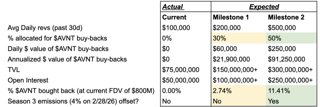 - Milestone 1: Buyback akan dilakukan jika pendapatan harian rata-rata Avantis di atas $200.000, tim akan mengalokasikan 30% dari biaya transaksi untuk melakukan buyback.