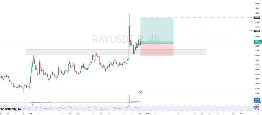Pergerakan harga RAY menunjukkan tanda pemulihan (rebound) setelah sebelumnya mengalami tekanan jual dan akhirnya menemukan support kuat di area $0.7015 – $0.7252. Reaksi harga di zona ini mengindikasikan adanya akumulasi, di mana tekanan beli berhasil membalikkan arah dari tren turun menjadi naik.