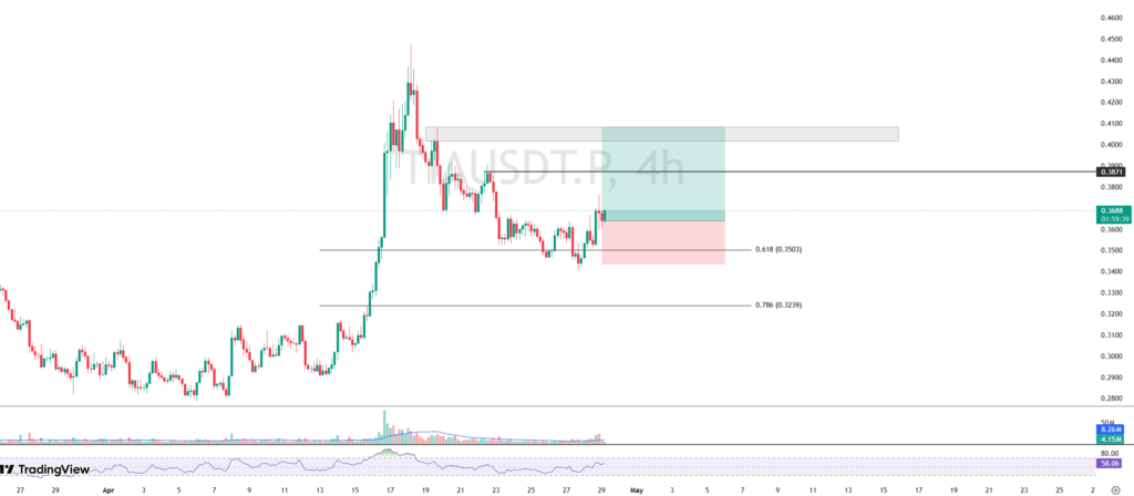 Pergerakan harga TIA menunjukkan sinyal rebound yang kuat setelah sebelumnya mengalami penurunan dan berhasil menemukan support pada area $0.3503, yang merupakan harmonic support sekaligus mencerminkan golden ratio (Fibonacci retracement)—zona yang sering menjadi titik pembalikan potensial.