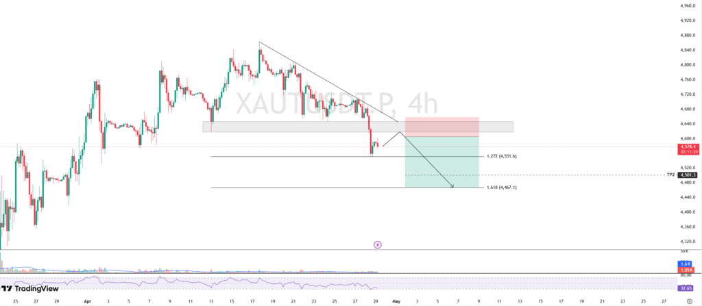 Apabila terjadi rejection yang valid—ditandai dengan candle bearish dan peningkatan volume jual—maka XAUT berpotensi melanjutkan penurunan menuju support terdekat di $4,551.6, dengan target lanjutan di area yang lebih rendah.