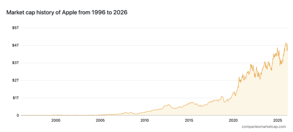 Seperti yang bisa dilihat dari grafik di atas, kapitalisasi pasa Apple terus mengalami lonjakan dari tahun ke tahun. Pada periode tahun 2020-2025, kapitalisasi pasar Apple melampaui $2 triliun dan terus naik hingga di atas $3 triliun pada periode 2023–2025. Per Februari 2026, market cap Apple berada di kisaran $4,049 triliun, menjadikannya salah satu perusahaan paling bernilai di dunia.