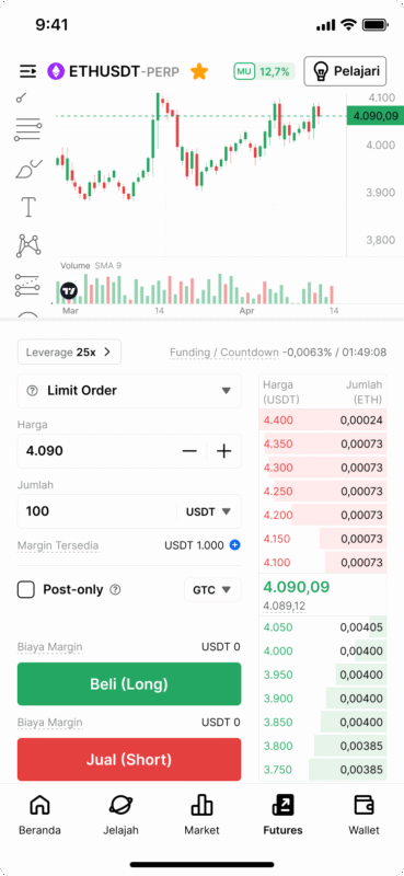 Buka aplikasi Pintu dan klik “Futures” untuk mengakses halaman pasar perpetual futures. Kamu bisa memilih aset langsung di tab bagian atas. Dalam contoh di bawah kita sedang melihat grafik ETHUSDT-PERP.