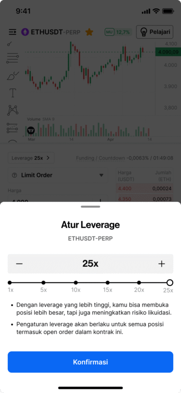 Kini, kamu bisa memilih leverage yang akan kamu gunakan di Pintu Futures mulai dari 1x hingga 25x! Semakin tinggi leverage, semakin tinggi juga risiko likuidasi.