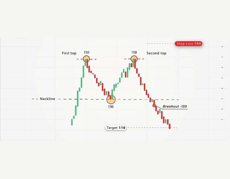 Pola double top biasanya mengawali koreksi tajam sampai aset mencapai titik support selanjutnya. Strategi yang bisa dilakukan trader adalah membuka posisi di titik puncak kedua (second top) atau di bawah neckline. Lalu, trader dapat memasang stop-loss di atas titik neckline dan menentukan level take profit di titik support selanjutnya.