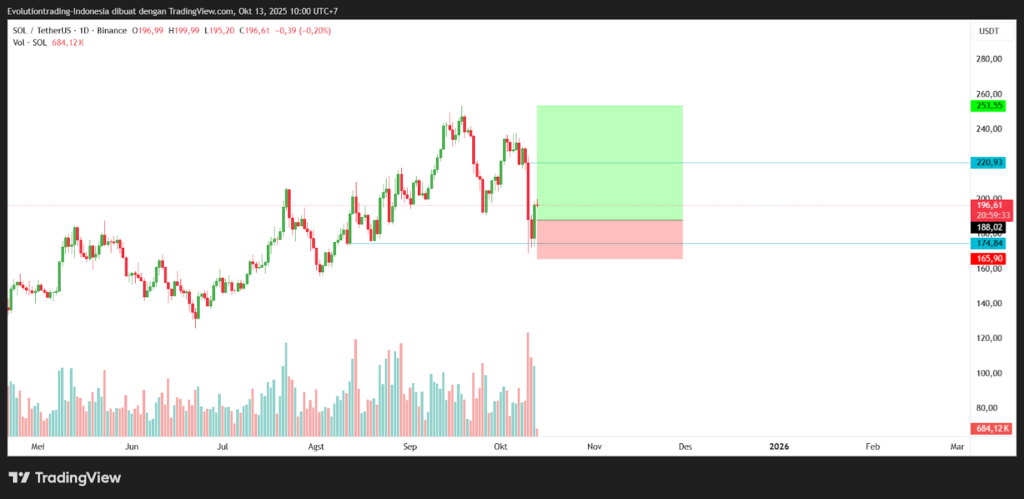 Untuk entry, kita dapat memanfaatkan pembentukan candle bullish engulfing di timeframe 1 hari pada Solana tersebut, dengan targetnya di sekitar pembukaan mother candle dan high yang terbentuk di tanggal 18 September 2025 yang akan berlaku sebagai resistance.