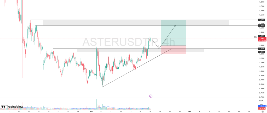Pergerakan harga ASTER berhasil breakout cluster resistance yang berada di level $1.2212 – $1.2599, yang saat ini beralih fungsi menjadi support penting untuk menjaga laju naik saat ini.