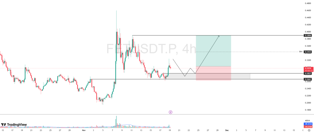 Horizontal support yang merupakan level RBS (resistance become support) di level $0.2661 masih menjadi benteng pertahanan solid untuk menahan penurunan harga FET.