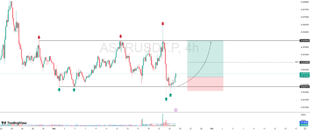 Rebound ASTR diperkirakan akan berlanjut dengan target kenaikan menuju resistance utama di level $0.025429, yang merupakan batas atas dari area konsolidasi.