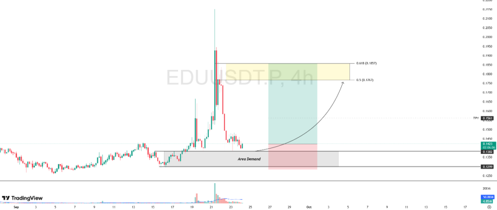 Pergerakan bullish EDU pada 20–21 September terhenti di level puncak $0.2150 sebelum mengalami koreksi. Penurunan harga kemudian menemukan support kuat pada area demand $0.1299–$0.1382.