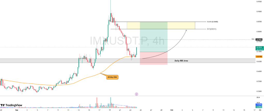Rebound IMX diperkirakan akan menguat dengan target kenaikan menuju golden pocket Fibonacci Retracement di kisaran $0.8121–$0.8488.