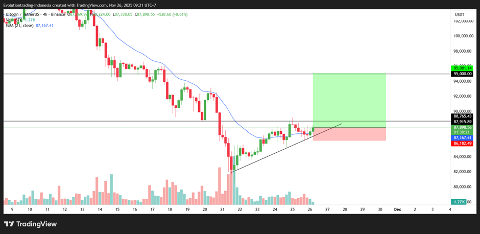 Jika Bitcoin dapat breakout dari level penting $88.760, maka Bitcoin bisa naik hingga ke $94.000 – $95.000.