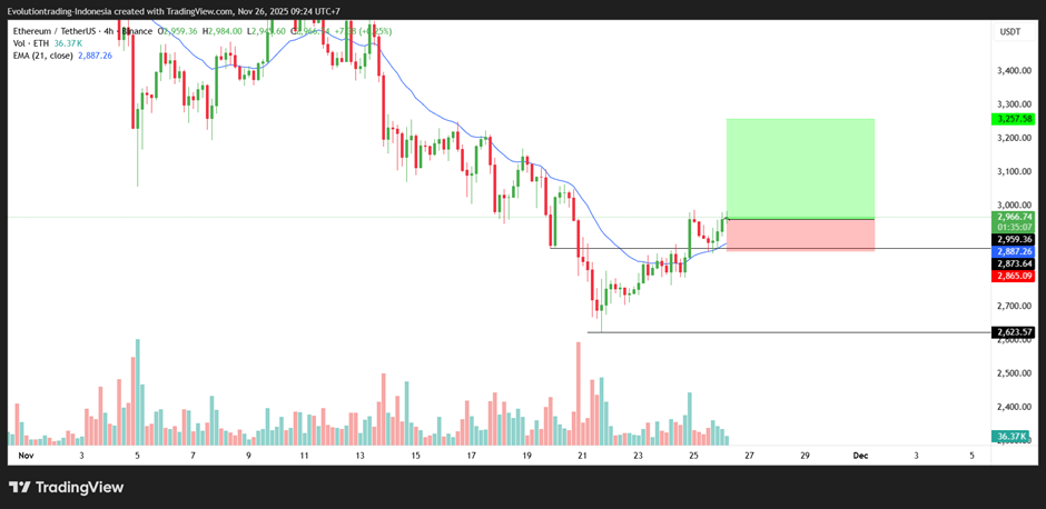 Ethereum berhasil breakout dari level $2873 yang berlaku sebagai resistance dan juga telah melakukan retest dari level tersebut. Ada kemungkinan bahwa ETH dapat melanjutkan kenaikannya.