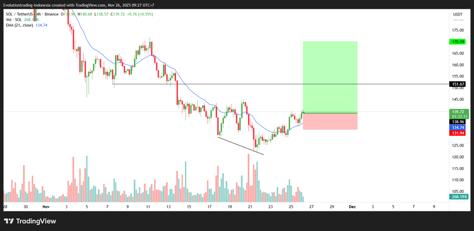 Solana berhasil breakout dari 21 EMA di timeframe 4 jamnya dan membentuk struktur bullish dari pembentukan higher high dan higher low. Hal ini membuat bias Solana bullish.