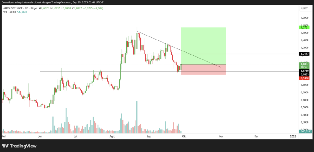 AERO terlihat menunjukkan potensi bullish reversal, ditandai dengan pembentukan candlestick tweezer bottom di timerframe 1 hari saat harga menyentuh support-nya di $1,078 (Rp.18.029) yang merupakan area resistance become support.