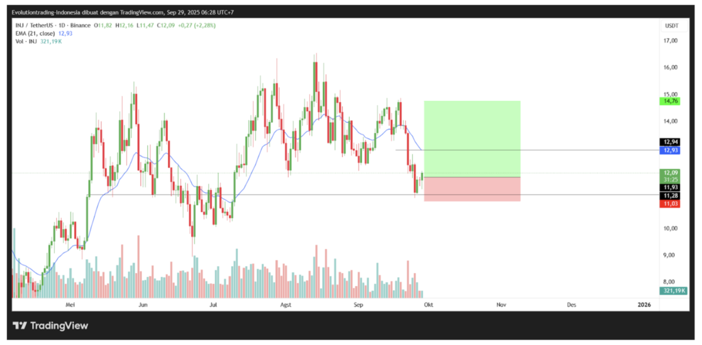 Kita dapat mencoba mencari posisi pembelian bagi Injective Protocol dengan mengarah ke 21 EMA dan swing high-nya di sekitar $14.76 (Rp.246.861) dengan stop loss sedikit di bawah area support.