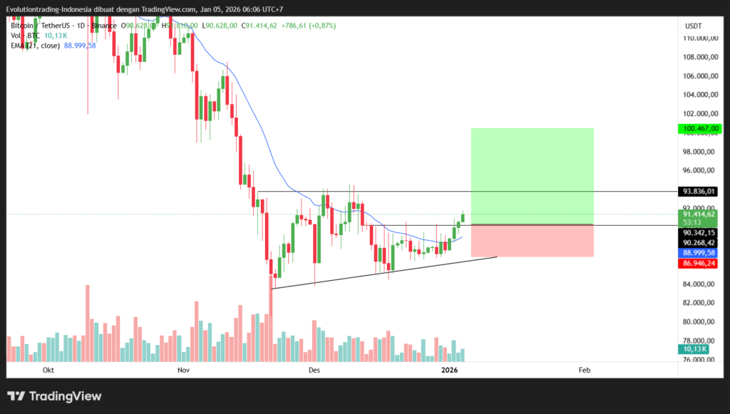 Pengambilan posisi trading dapat dilakukan saat Bitcoin melakukan retest dari area $90.000 dengan invalidasi di bawah $86.900.